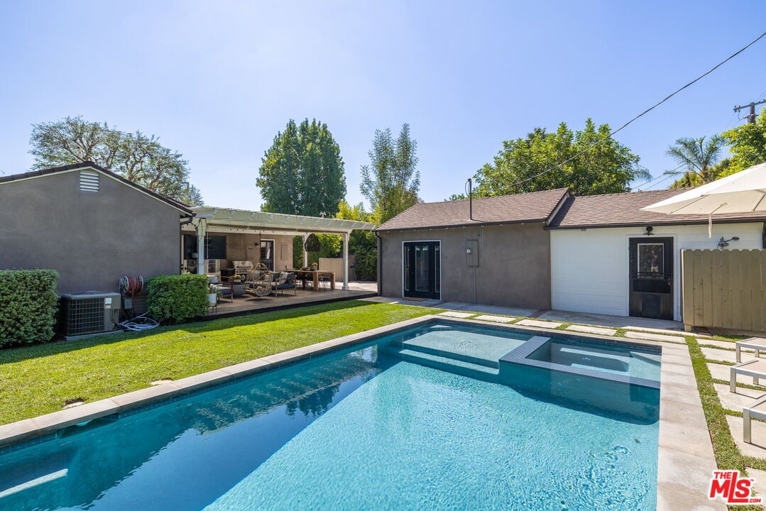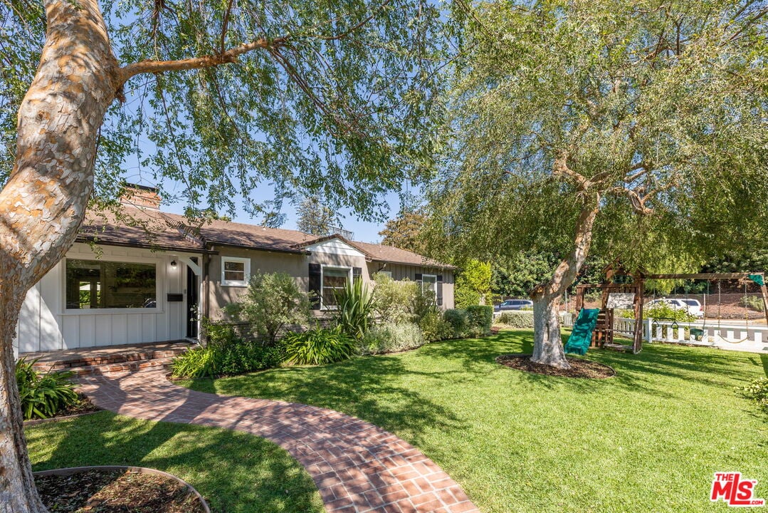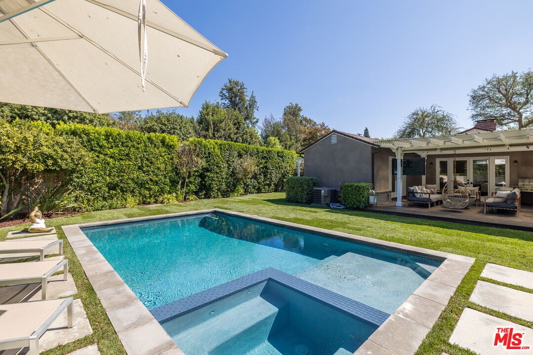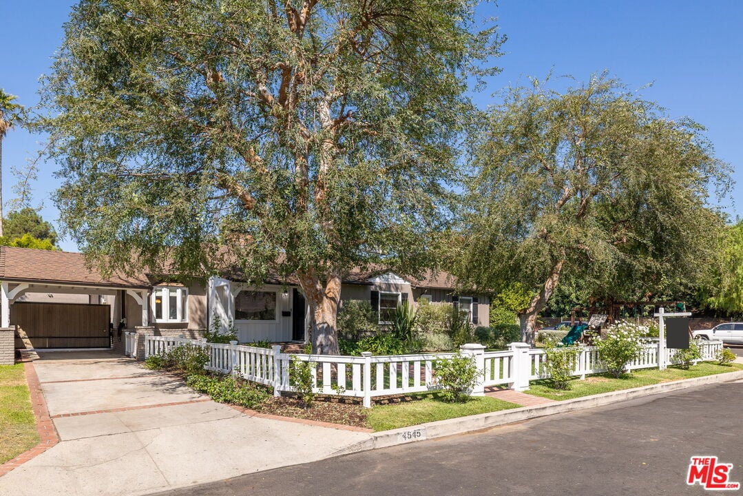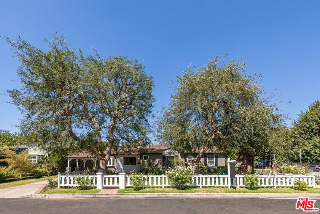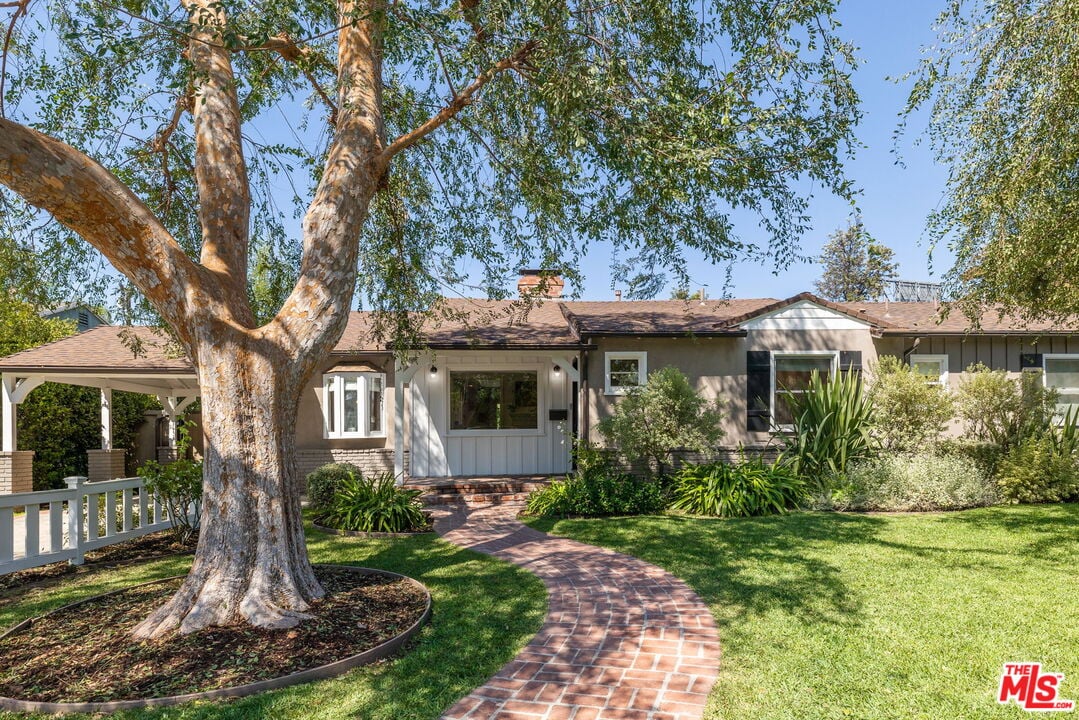 Sophisticated, traditional ranch with pool/spa in prime Sherman Oaks. Located on a 10,341 SF corner lot, this meticulously maintained, 4 bedroom, 4.5 bathroom home features a 2,237SF main house, 330SF fully air-conditioned garage, and 196SF (included in SF) air conditioned bonus space that can be used as an office, gym or art studio. With stunning curb appeal, mature trees provide ample shade as a white picket fence and brick walkway lead you to the front door. Upon entering, you are greeted by a dual fireplace, wide plank wood floors, and a bright and light interior. This ideal floor plan includes a formal living and dining area perfect for entertaining and an impressive adjacent family room adorned with vaulted ceilings, skylights, and french doors leading to a private outdoor living area and backyard with a stunning pool, built-in spa, and outdoor shower. The updated, modern kitchen features custom cabinets, Carerra marble countertops and Thermador appliances. Enjoy morning coffee or sunset cocktails on the outdoor patio of the primary bedroom and en-suite bathroom which features top quality materials and fixtures from Waterworks and Kohler. Three additional bedrooms offer flexibility for your home or office needs. Conveniently located minutes from schools, parks, and the shops and restaurants of Ventura Blvd, the Sportsman Lodge development, and nearby Studio City. With its prime location, elegant details and upgrades, this spacious haven offers exceptional luxury to be enjoyed each and every day.